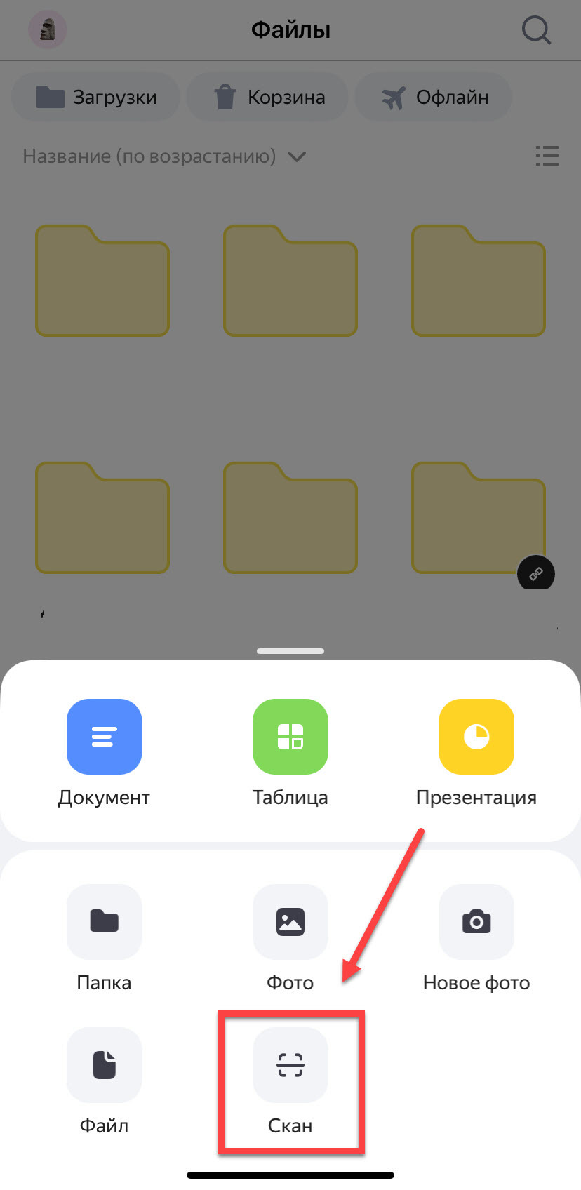 Далее, когда вы войдете в приложение, вам нужно нажать на значок плюсика в правом нижнем углу и в открывшемся меню выбрать пункт "Скан".
